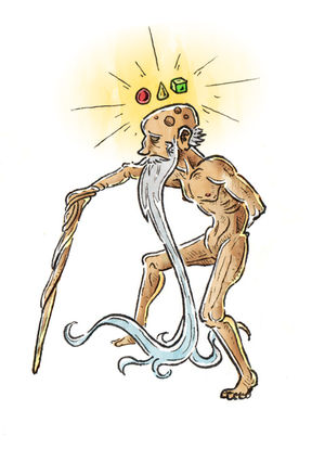 An agel is a hunched-over humanoid figure whose right arm is permanently affixed to a cane, reaching the ground. It is the very image of the idealized old man who needs a cane to walk. It has one hand, its left.
